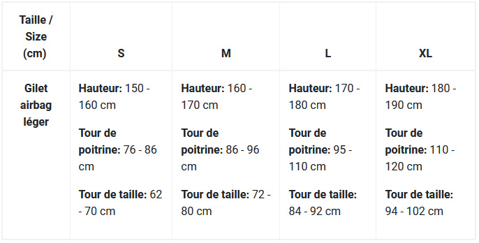 Attention, pour permettre à l'airbag de se gonfler en cas de chute, l'utilisateur poids avoir un poids minimal de 30 kg. L'utilisation du gilet airbag est interdite chez les femmes enceinte.