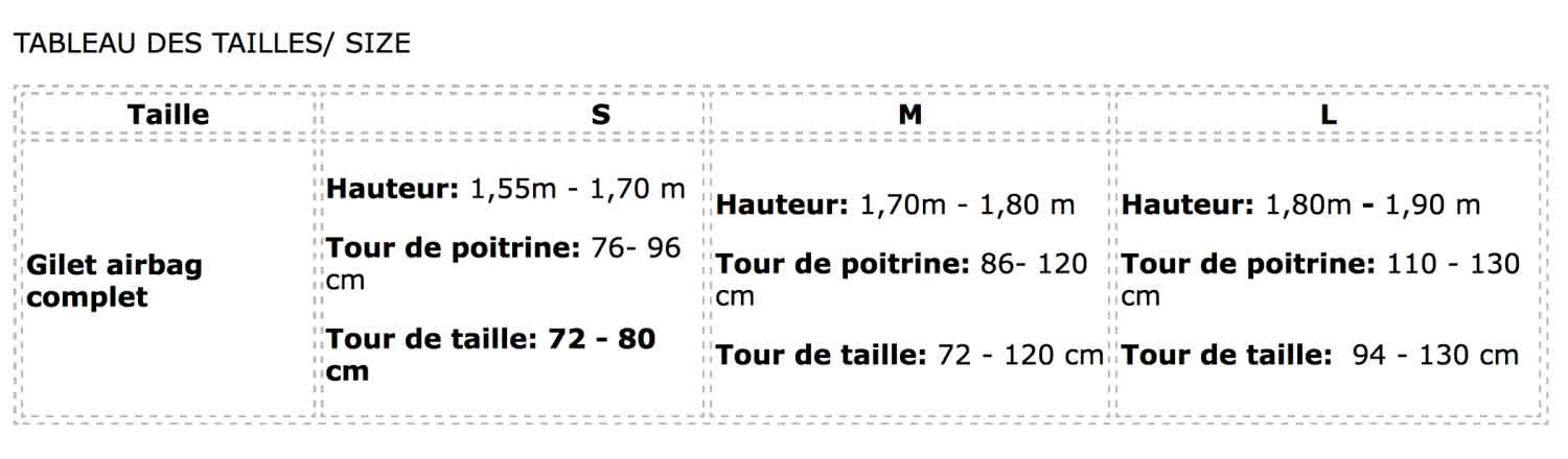 Guide des tailles du gilet airbag Complet Hit Air MLV :