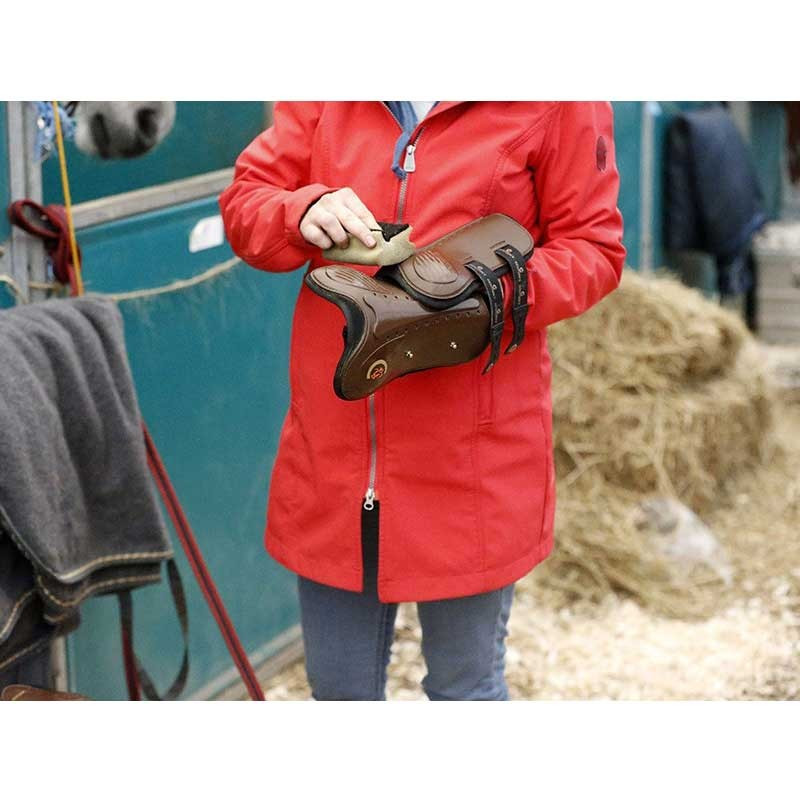 Vaporisez sur les guêtres d'équitation sèches et sales en matière TPU et utilisez un chiffon propre pour nettoyer la surface. Le spray donnera instantanément à vos guêtres leurs brillances des premiers jours.