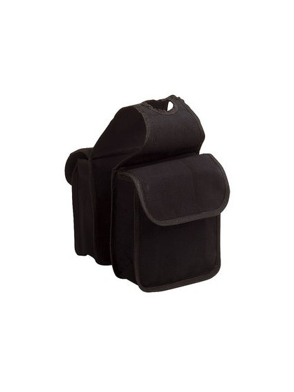 Sacoche haute intégrant une poche camouflée avec 2 sanglons réglables pour fixation à la selle par mousquetons. Avec fermeture à glissières et 4 anneaux en acier nickelé.